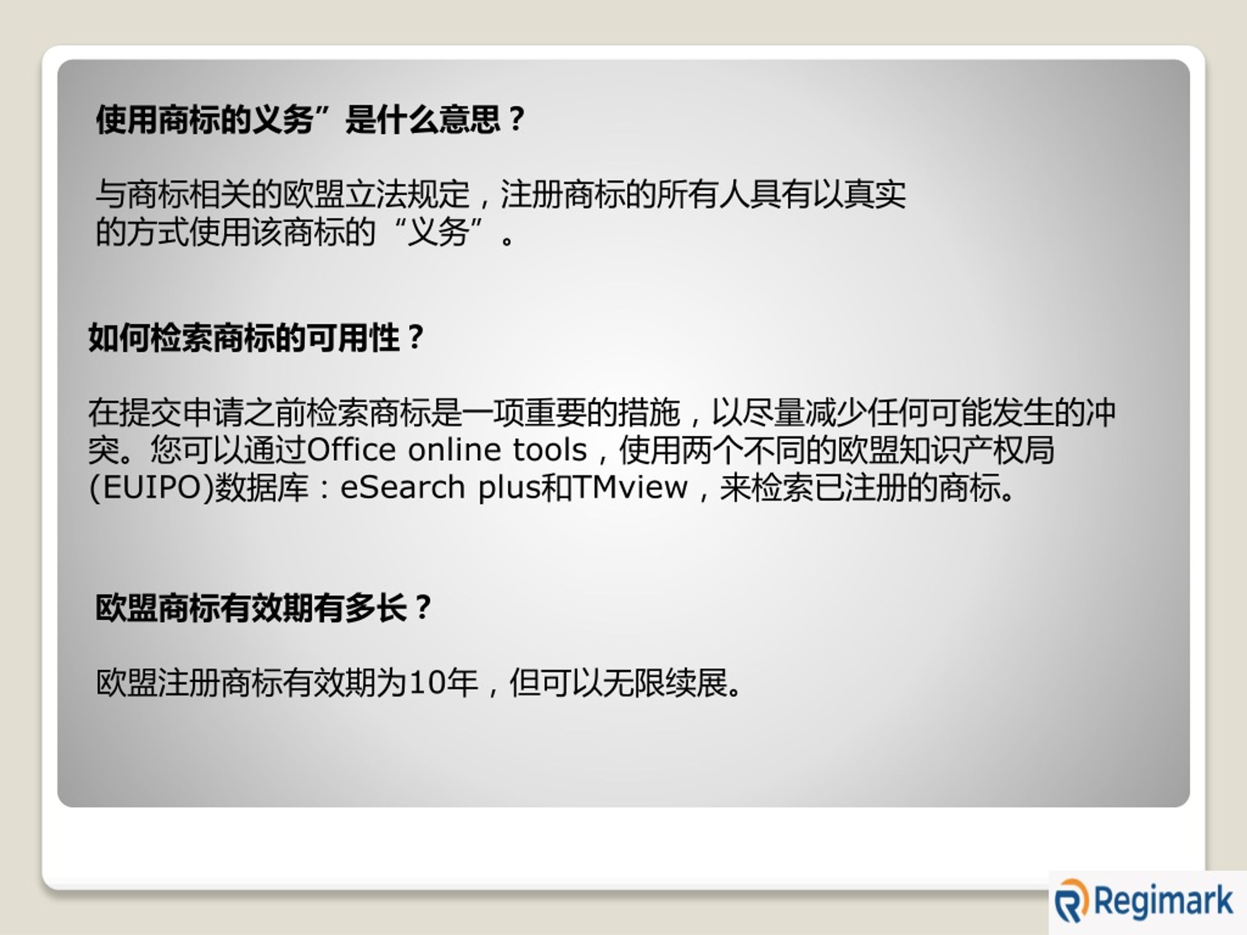 使用商标的义务”是什么意思? 与商标相关的欧盟立法规定,注册商标的所有人具有以真实的方式使用该商标的“义务”。 如何检索商标的可用性? 在提交申请之前检索商标是一项重要的措施,以尽量减少任何可能发生的冲突。您可以通过Office online tools,使用两个不同的欧盟知识产权局(EUIPO)数据库:eSearch plus和TMview,来检索已注册的商标。 欧盟商标有效期有多长? 欧盟注册商标有效期为10年,但可以无限续展。