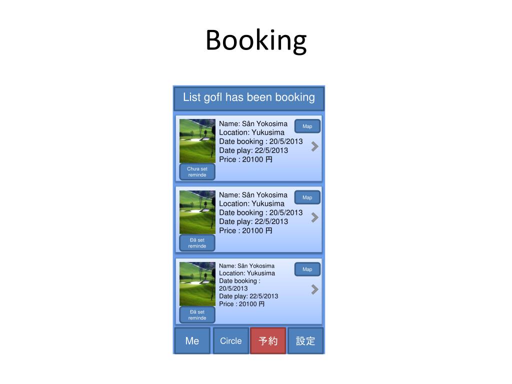 Booking List gofl has been booking Name: SânYokosima Location: Yukusima Date booking : 20/5/2013 Date play: 22/5/2013 Price : 20100 円 Map Chưa set reminde ヤード:GDO1 Name: SânYokosima Location: Yukusima Date booking : 20/5/2013 Date play: 22/5/2013 Price : 20100 円 Map Đã set reminde ヤード:GDO1 Name: SânYokosima Location: Yukusima Date booking : 20/5/2013 Date play: 22/5/2013 Price : 20100 円 Map Đã set reminde Me Circle 予約 設定