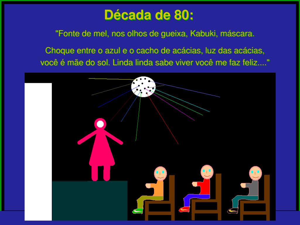 Década de 80: "Fonte de mel, nos olhos de gueixa, Kabuki, máscara. Choque entre o azul e o cacho de acácias, luz das acácias, você é mãe do sol. Linda linda sabe viver você me faz feliz...." "Fonte de mel, nos olhos de gueixa, Kabuki, máscara. Choque entre o azul e o cacho de acácias, luz das acácias, você é mãe do sol. Linda linda sabe viver você me faz feliz...."