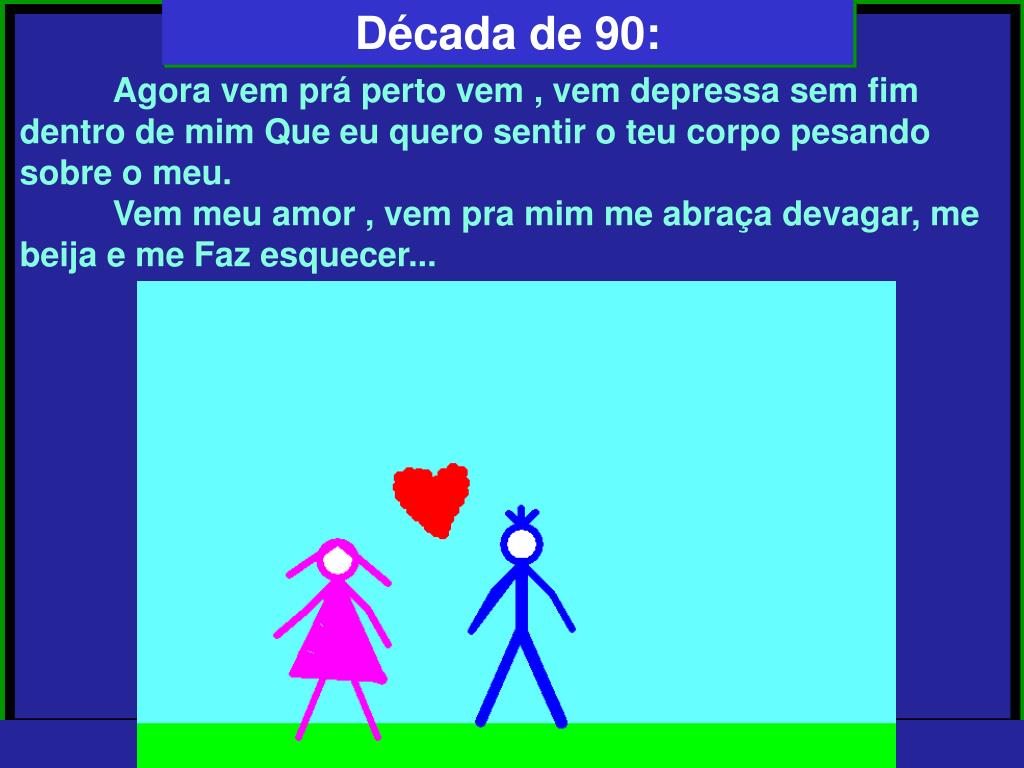 Década de 90: Agora vem prá perto vem , vem depressa sem fim dentro de mim Que eu quero sentir o teu corpo pesando sobre o meu. Vem meu amor , vem pra mim me abraça devagar, me beija e me Faz esquecer... “Agora vem pra perto vemvem depressa vem sem fim dentro de mimque eu quero sentiro teu corpo pesando sobre o meuvem meu amor vem pra mim,me abraça devagar,me beija e me faz esquecer. “