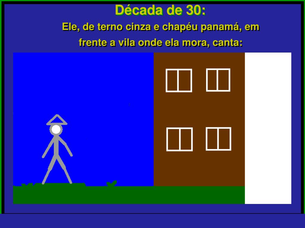 Década de 30: Ele, de terno cinza e chapéu panamá, em frente a vila onde ela mora, canta: Ele, de terno cinza e chapéu panamá, em frente à vila onde ela mora, canta: