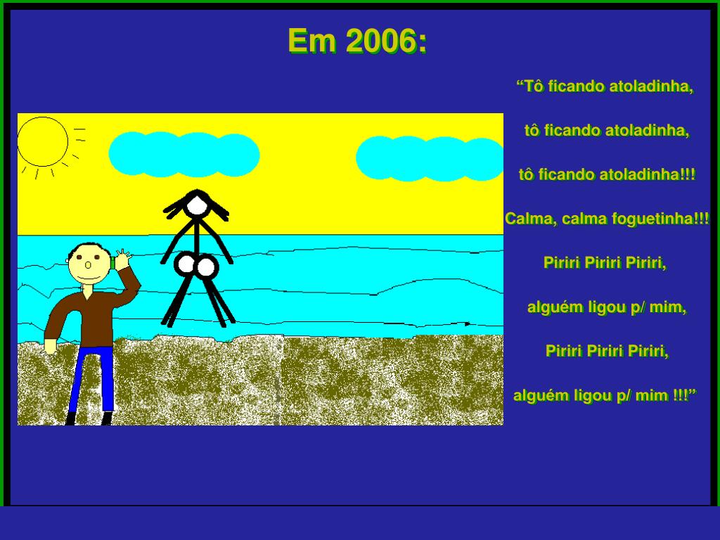 Em 2006: “Tô ficando atoladinha, tô ficando atoladinha, tô ficando atoladinha!!! Calma, calma foguetinha!!! PiririPiririPiriri, alguém ligou p/ mim, PiririPiririPiriri, alguém ligou p/ mim !!!”