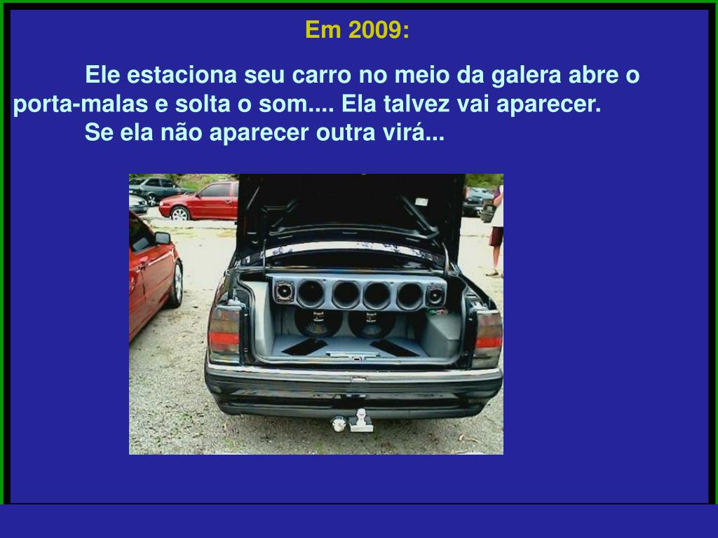 Em 2009: Ele estaciona seu carro no meio da galera abre o porta-malas e solta o som.... Ela talvez vai aparecer. Se ela não aparecer outra virá...