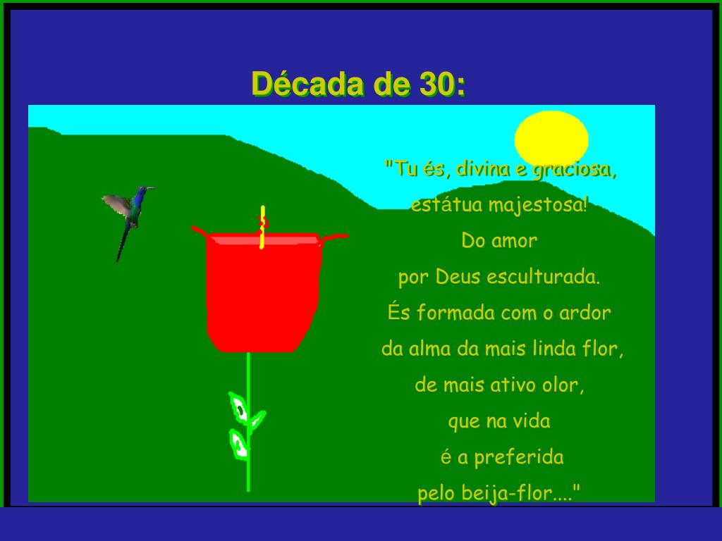 Década de 30: "Tu és, divina e graciosa, estátua majestosa! Do amor por Deus esculturada. És formada com o ardor da alma da mais linda flor, de mais ativo olor, que na vida é a preferida pelo beija-flor...."