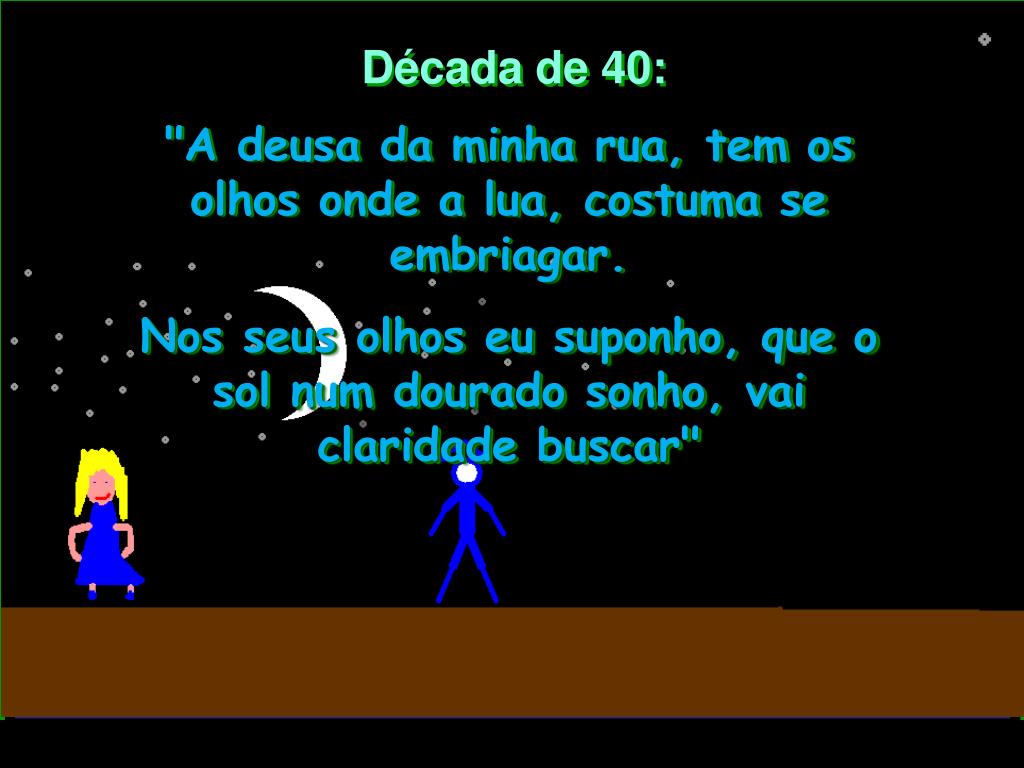 Década de 40: "A deusa da minha rua, tem os olhos onde a lua, costuma se embriagar. Nos seus olhos eu suponho, que o sol num dourado sonho, vai claridade buscar"