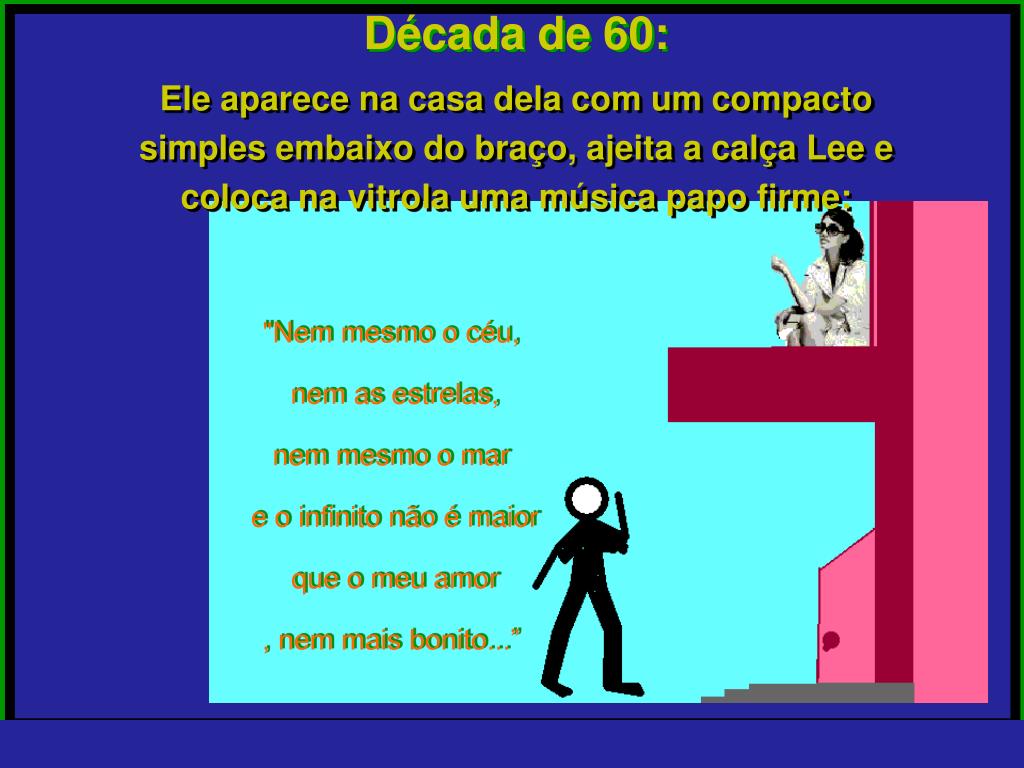 Década de 60: Ele aparece na casa dela com um compacto simples embaixo do braço, ajeita a calça Lee e coloca na vitrola uma música papo firme: "Nem mesmo o céu, nem as estrelas, nem mesmo o mar e o infinito não é maior que o meu amor , nem mais bonito...”
