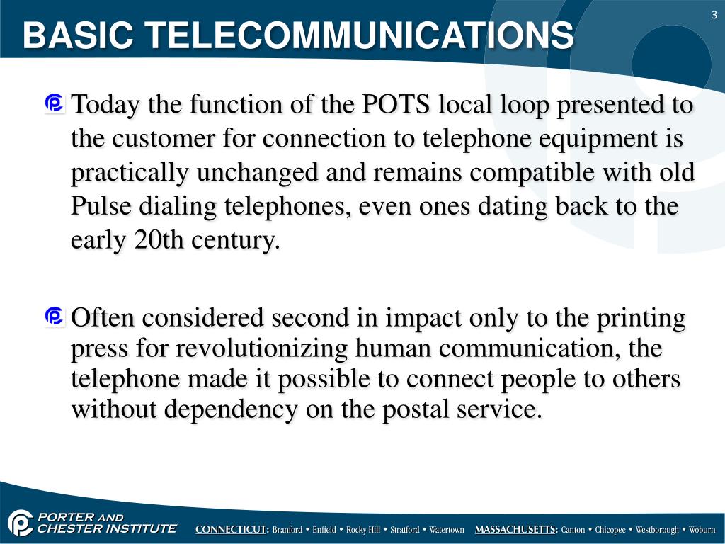 BASIC TELECOMMUNICATIONS • Today the function of the POTS local loop presented to the customer for connection to telephone equipment is practically unchanged and remains compatible with old Pulse dialing telephones, even ones dating back to the early 20th century. • Often considered second in impact only to the printing press for revolutionizing human communication, the telephone made it possible to connect people to others without dependency on the postal service.