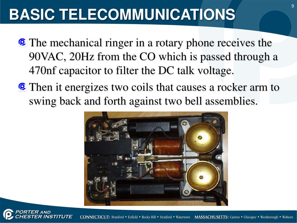 BASIC TELECOMMUNICATIONS • The mechanical ringer in a rotary phone receives the 90VAC, 20Hz from the CO which is passed through a 470nf capacitor to filter the DC talk voltage. • Then it energizes two coils that causes a rocker arm to swing back and forth against two bell assemblies.
