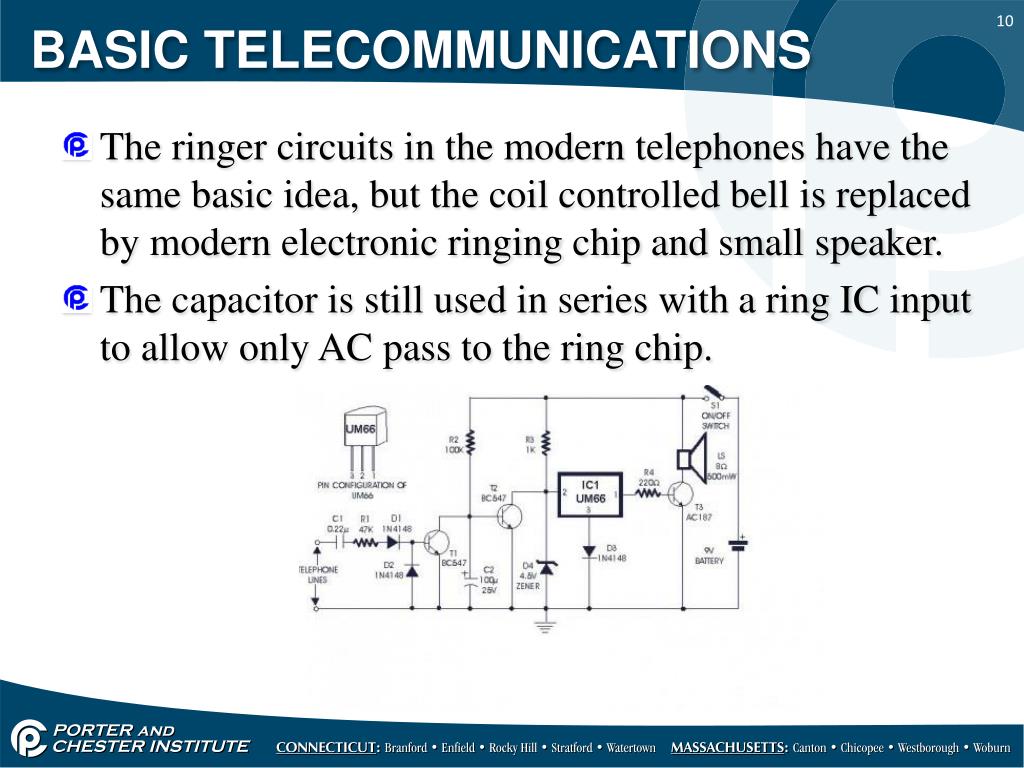 BASIC TELECOMMUNICATIONS • The ringer circuits in the modern telephones have the same basic idea, but the coil controlled bell is replaced by modern electronic ringing chip and small speaker. • The capacitor is still used in series with a ring IC input to allow only AC pass to the ring chip.