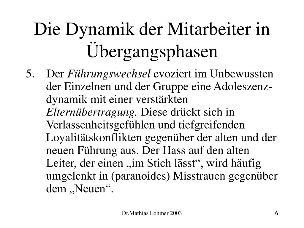 Die Dynamik der Mitarbeiter in Übergangsphasen 5. Der Führungswechsel evoziert im Unbewussten der Einzelnen und der Gruppe eine Adoleszenz- dynamik mit einer verstärkten Elternübertragung. Diese drückt sich in Verlassenheitsgefühlen und tiefgreifenden Loyalitätskonflikten gegenüber der alten und der neuen Führung aus. Der Hass auf den alten Leiter, der einen „im Stich lässt“, wird häufig umgelenkt in (paranoides) Misstrauen gegenüber dem „Neuen“. Dr.Mathias Lohmer 2003