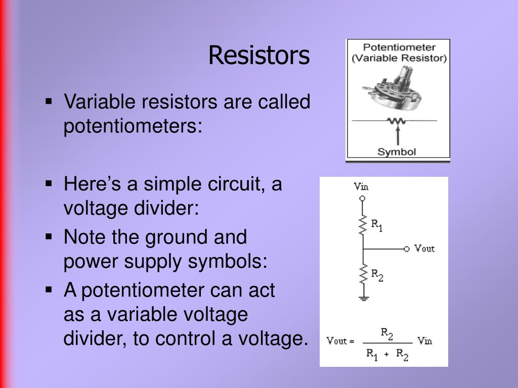 Resistors • Variable resistors are called potentiometers: • Here’s a simple circuit, avoltage divider: • Note the ground and power supply symbols: • A potentiometer can actas a variable voltage divider, to control a voltage.