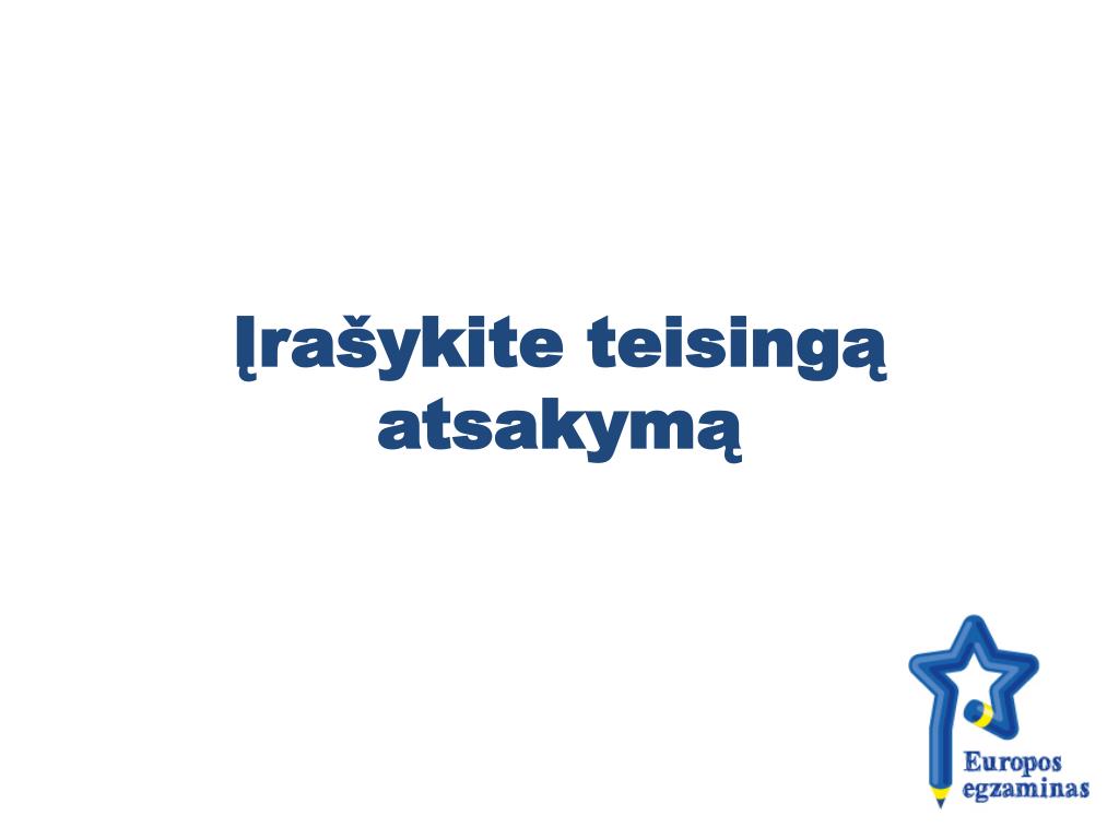 Egzamino taisyklės Pasirinkto(-ų) atsakymo(-ų) raidę pažymėkite lapelyje. Atsakymui pasirinkti turėsite 60 sek.