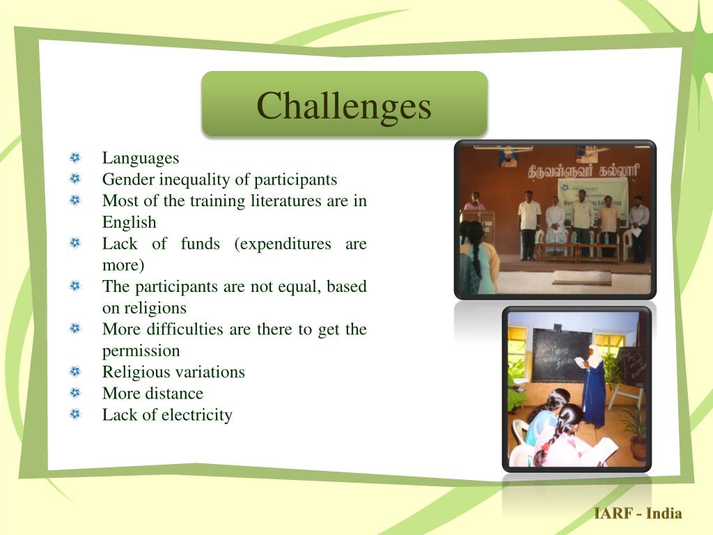 Challenges • Languages • Gender inequality of participants • Most of the training literatures are in English • Lack of funds (expenditures are more) • The participants are not equal, based on religions • More difficulties are there to get the permission • Religious variations • More distance • Lack of electricity IARF - India