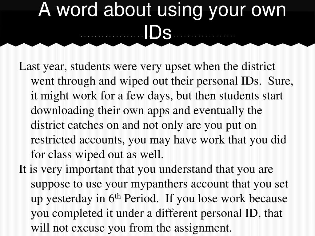 A word about using your own IDs Last year, students were very upset when the district went through and wiped out their personal IDs. Sure, it might work for a few days, but then students start downloading their own apps and eventually the district catches on and not only are you put on restricted accounts, you may have work that you did for class wiped out as well. It is very important that you understand that you are suppose to use your mypanthers account that you set up yesterday in 6th Period. If you lose work because you completed it under a different personal ID, that will not excuse you from the assignment.