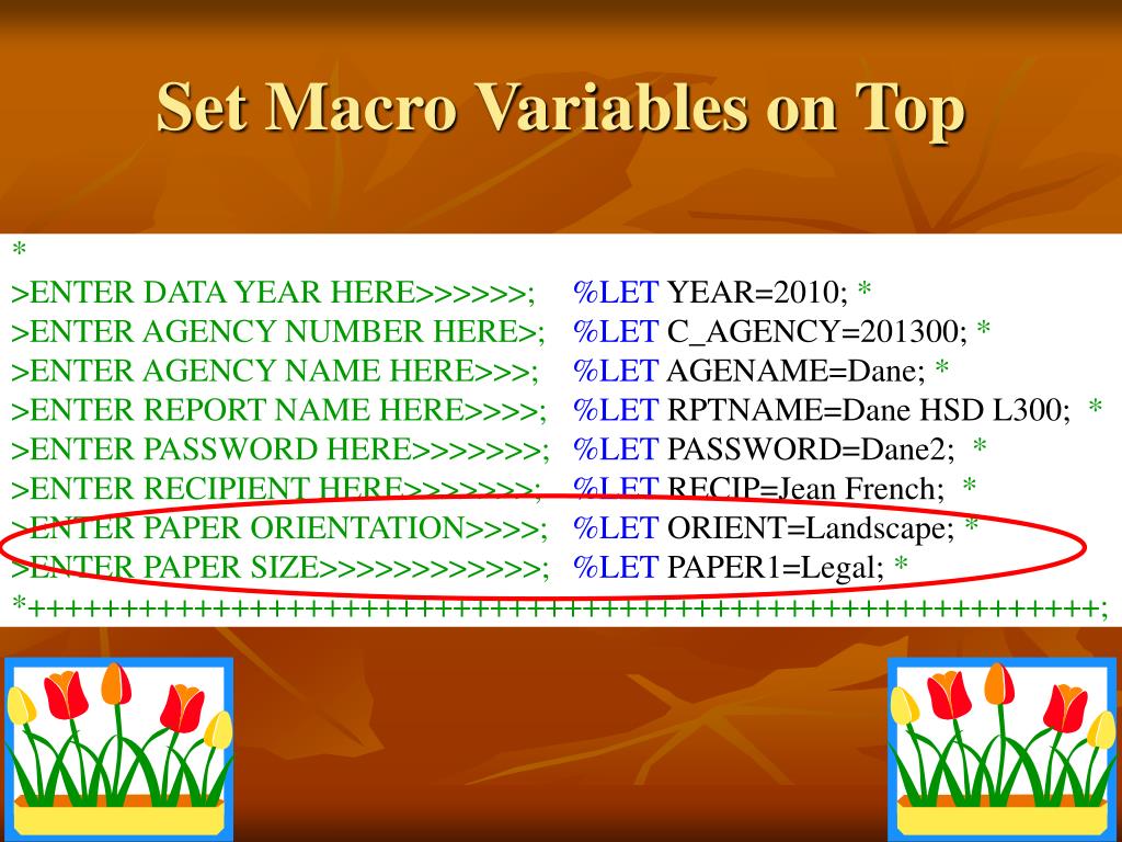 Abstract • Use macro variables to • Simplify repetitive actions • Know what you’re pulling • Verify report before printing • Guide Dynamic Data Exchange (DDE)