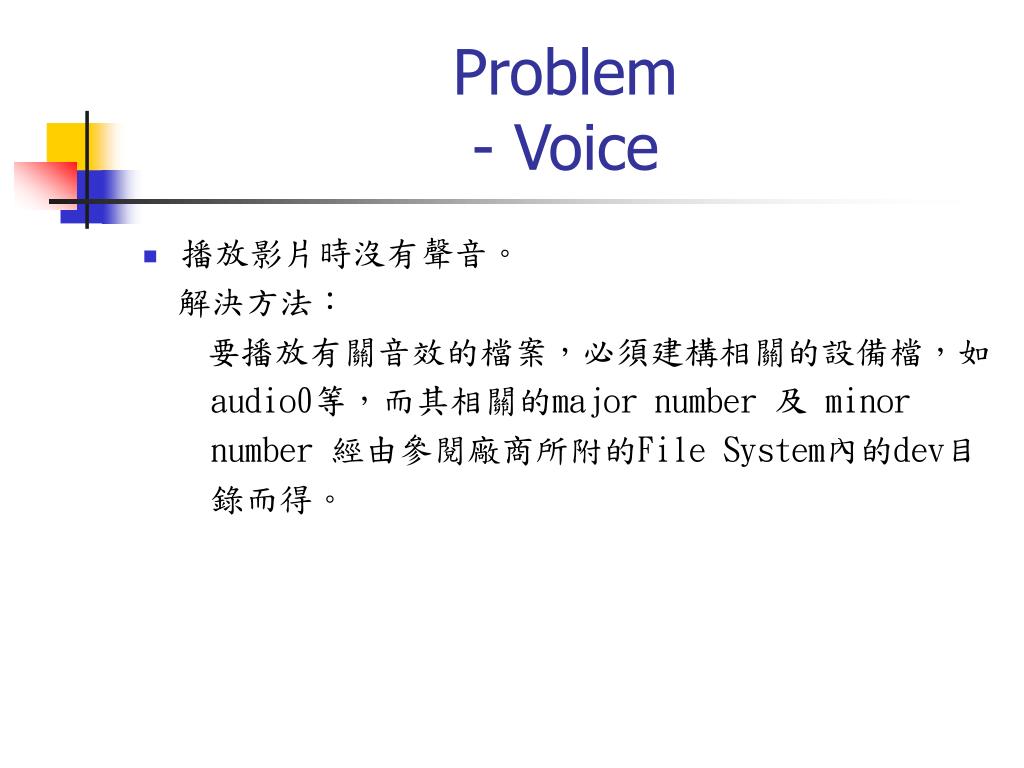 Problem- Voice • 播放影片時沒有聲音。 解決方法: 要播放有關音效的檔案,必須建構相關的設備檔,如 audio0等,而其相關的major number 及 minor number 經由參閱廠商所附的File System內的dev目 錄而得。