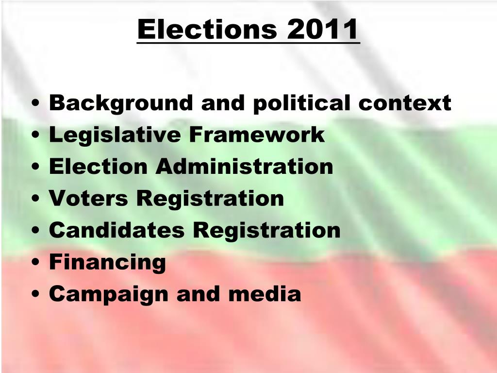 Elections 2011 • Background and political context • Legislative Framework • Election Administration • Voters Registration • Candidates Registration • Financing • Campaign and media