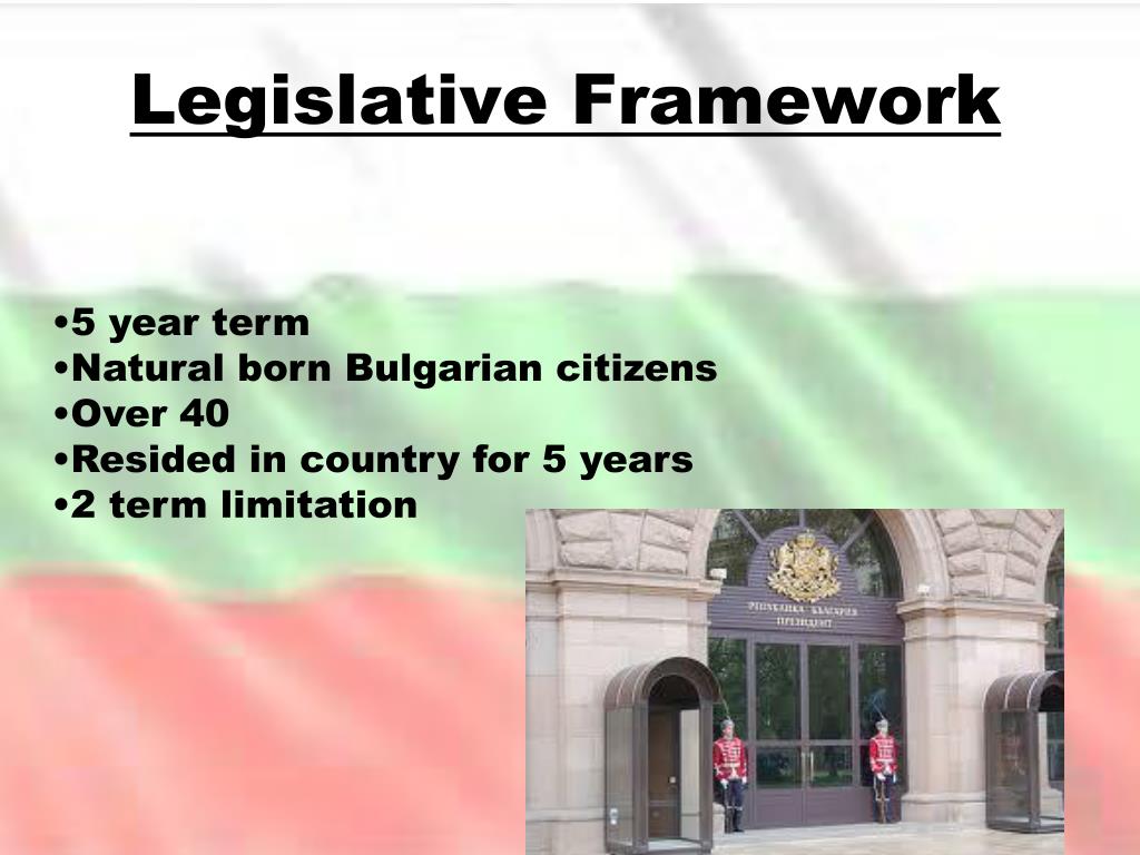 Legislative Framework • 5 year term • Natural born Bulgarian citizens • Over 40 • Resided in country for 5 years • 2 term limitation