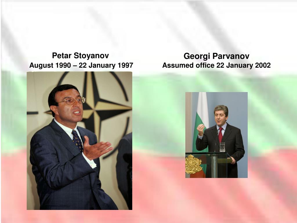 PetarStoyanov August 1990 – 22 January 1997 GeorgiParvanov Assumed office22 January 2002