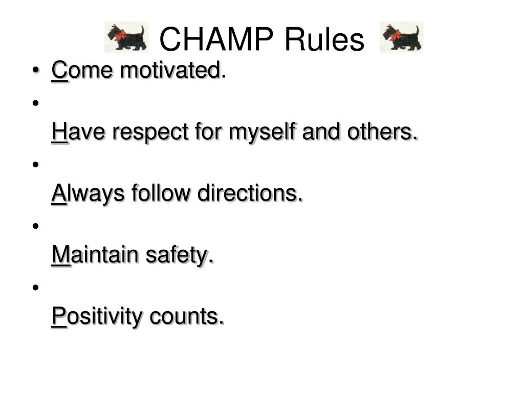 CHAMP Rules • Come motivated. • Have respect for myself and others. • Always follow directions. • Maintain safety. • Positivity counts.