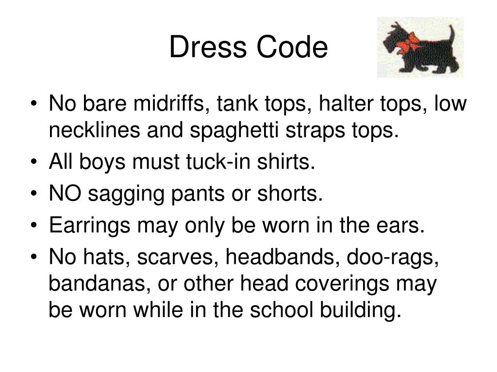 Dress Code • No bare midriffs, tank tops, halter tops, low necklines and spaghetti straps tops. • All boys must tuck-in shirts. • NO sagging pants or shorts. • Earrings may only be worn in the ears. • No hats, scarves, headbands, doo-rags, bandanas, or other head coverings may be worn while in the school building.