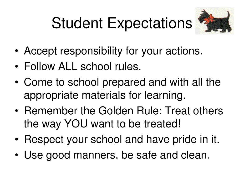 Student Expectations • Accept responsibility for your actions. • Follow ALL school rules. • Come to school prepared and with all the appropriate materials for learning. • Remember the Golden Rule: Treat others the way YOU want to be treated! • Respect your school and have pride in it. • Use good manners, be safe and clean.
