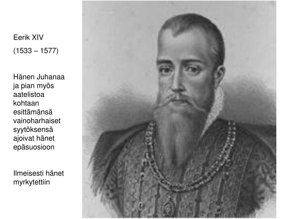 Eerik XIV (1533 – 1577) Hänen Juhanaa ja pian myös aatelistoa kohtaan esittämänsä vainoharhaiset syytöksensä ajoivat hänet epäsuosioon Ilmeisesti hänet myrkytettiin