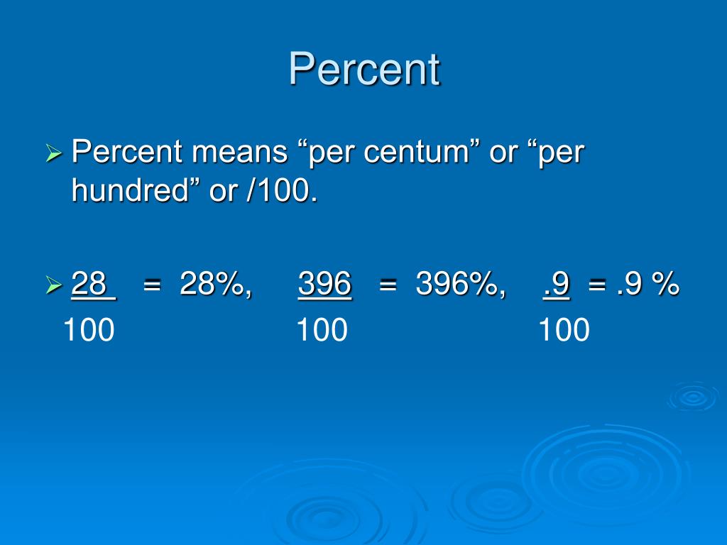 Percent • Percent means “per centum” or “per hundred” or /100. • 28 = 28%, 396 = 396%, .9 = .9 % 100 100 100