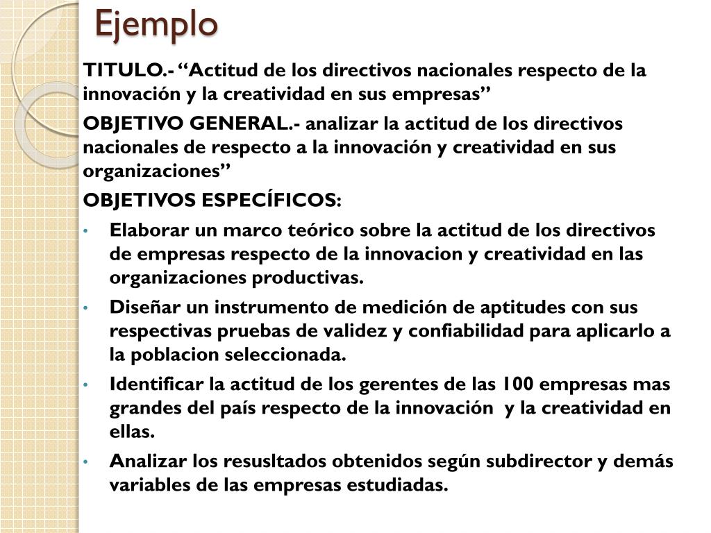 Ejemplo TITULO.- “Actitud de los directivos nacionales respecto de la innovación y la creatividad en sus empresas” OBJETIVO GENERAL.- analizar la actitud de los directivos nacionales de respecto a la innovación y creatividad en sus organizaciones” OBJETIVOS ESPECÍFICOS: • Elaborar un marco teórico sobre la actitud de los directivos de empresas respecto de la innovacion y creatividad en las organizaciones productivas. • Diseñar un instrumento de medición de aptitudes con susrespectivaspruebas de validez y confiabilidadparaaplicarlo a la poblacionseleccionada. • Identificar la actitud de los gerentes de las 100 empresas mas grandes del paísrespecto de la innovación y la creatividad en ellas. • Analizar los resusltadosobtenidossegúnsubdirector y demás variables de lasempresasestudiadas.