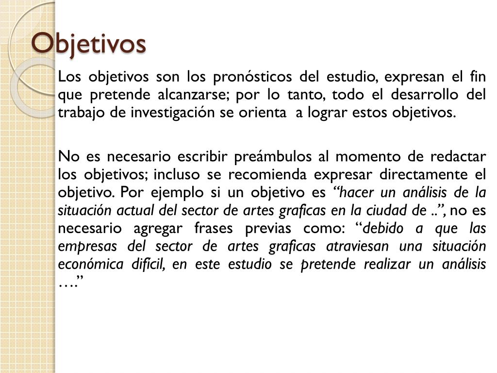Objetivos Los objetivos son los pronósticos del estudio, expresan el fin que pretende alcanzarse; por lo tanto, todo el desarrollo del trabajo de investigación se orienta a lograr estos objetivos. No es necesario escribir preámbulos al momento de redactar los objetivos; incluso se recomienda expresar directamente el objetivo. Por ejemplo si un objetivo es “hacer un análisis de la situación actual del sector de artes graficas en la ciudad de ..”, no es necesario agregar frases previas como: “debido a que las empresas del sector de artes graficas atraviesan una situación económica difícil, en este estudio se pretende realizar un análisis ….”