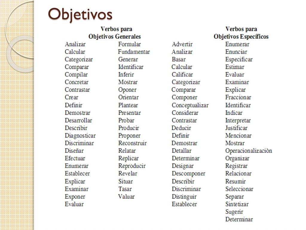 Objetivos: verbos podrían ser: • Determinar • Identificar • Evaluar • Describir • Formular • Verificar • Diseñar • Elaborar • Proponer • Analizar • Definir • Conocer • Estudiar • Plantear • Corroborar