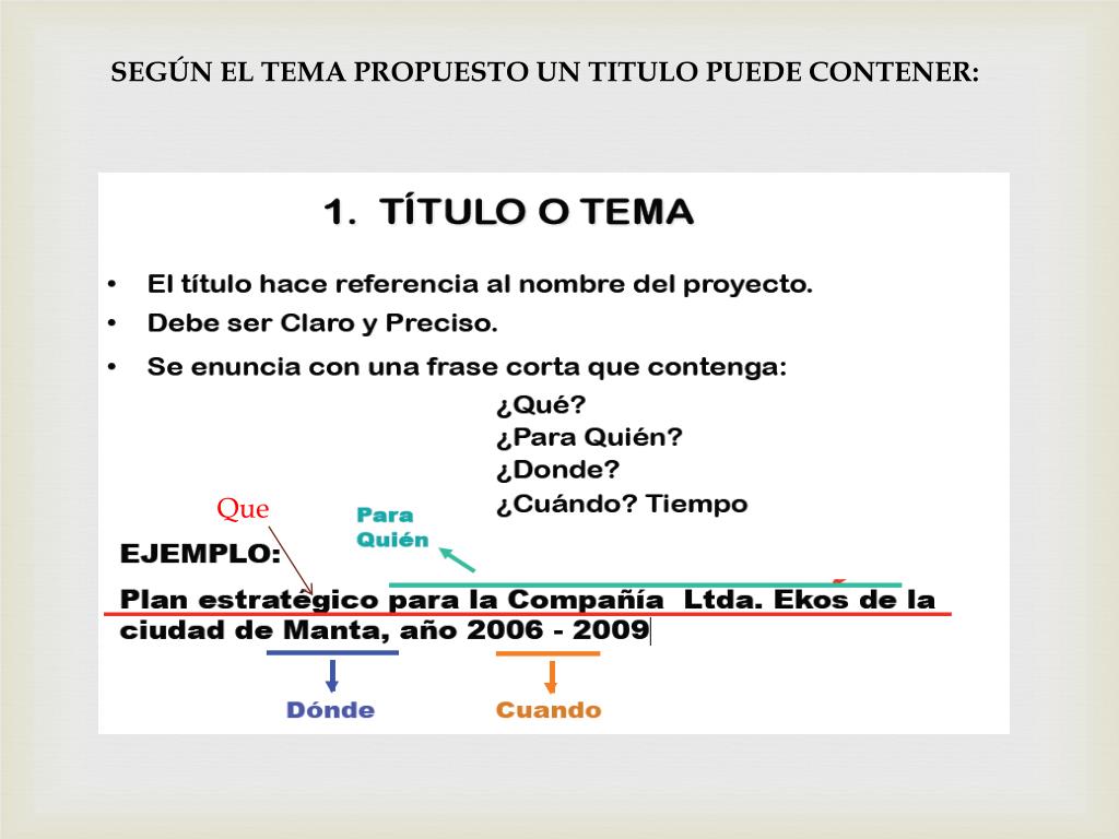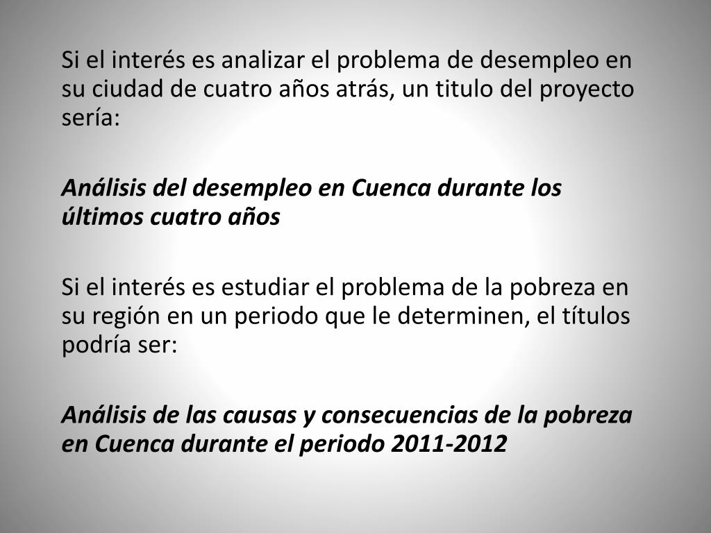 Si el interés es analizar el problema de desempleo en su ciudad de cuatro años atrás, un titulo del proyecto sería: Análisis del desempleo en Cuenca durante los últimos cuatro años Si el interés es estudiar el problema de la pobreza en su región en un periodo que le determinen, el títulos podría ser: Análisis de las causas y consecuencias de la pobreza en Cuenca durante el periodo 2011-2012