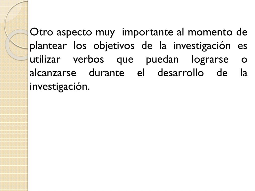 Otro aspecto muy importante al momento de plantear los objetivos de la investigación es utilizar verbos que puedan lograrse o alcanzarse durante el desarrollo de la investigación.