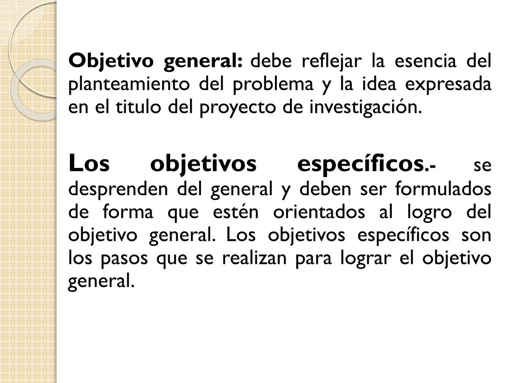 Objetivo general: debe reflejar la esencia del planteamiento del problema y la idea expresada en el titulo del proyecto de investigación. Los objetivos específicos.- se desprenden del general y deben ser formulados de forma que estén orientados al logro del objetivo general. Los objetivosespecíficos son los pasosque se realizanparalograr el objetivo general.
