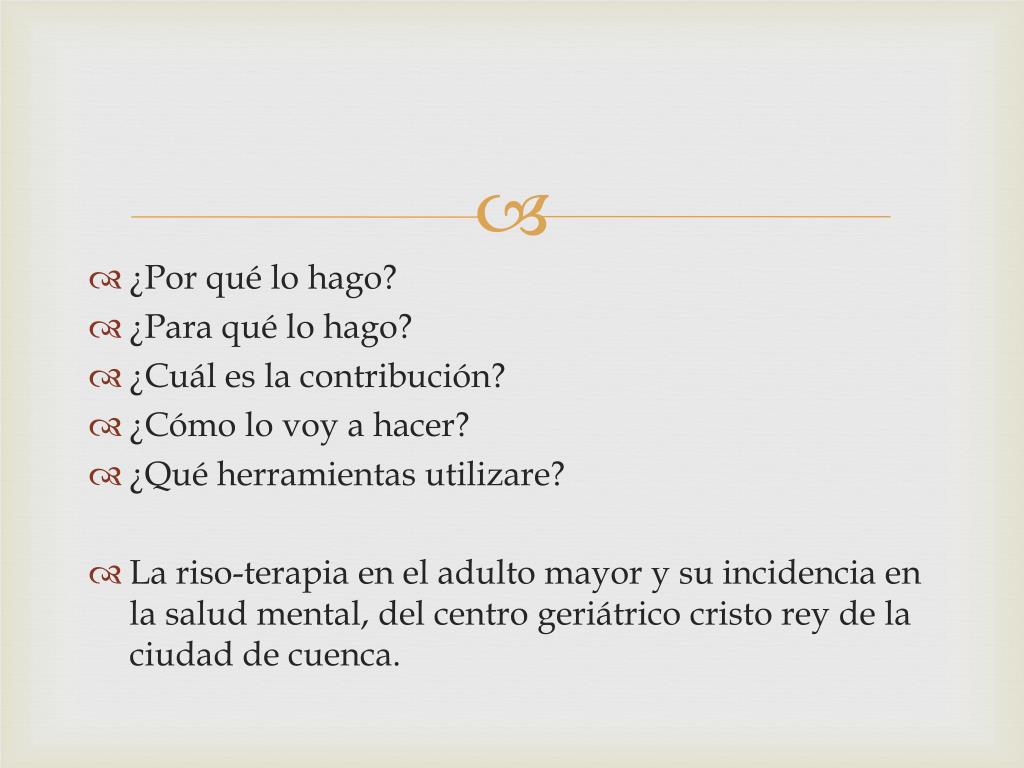 ¿Por qué lo hago? • ¿Para qué lo hago? • ¿Cuál es la contribución? • ¿Cómo lo voy a hacer? • ¿Qué herramientas utilizare? • La riso-terapia en el adulto mayor y su incidencia en la salud mental, del centro geriátrico cristo rey de la ciudad de cuenca.