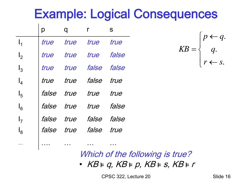 Example: Logical Consequences • Which of the following is true? • KB ⊧ q, KB ⊧ p, KB ⊧ s, KB ⊧ r CPSC 322, Lecture 20