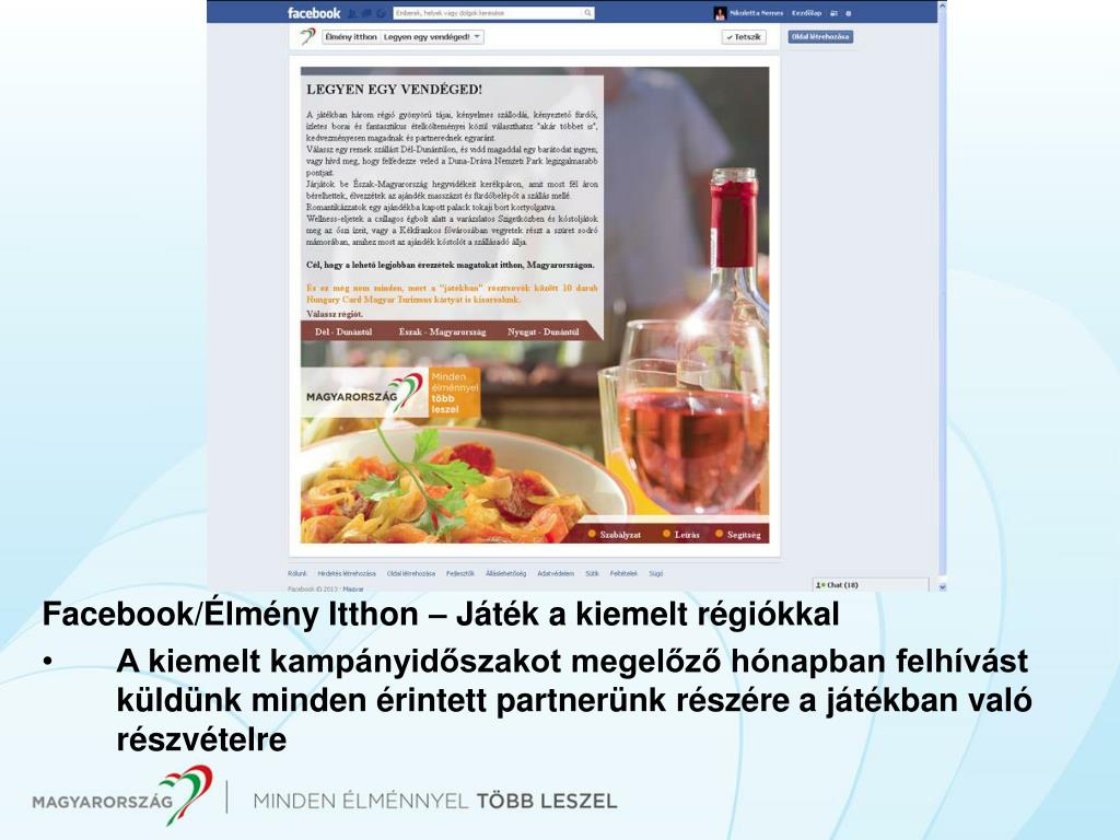 Facebook/Élmény Itthon – Játék a kiemelt régiókkal A kiemelt kampányidőszakot megelőző hónapban felhívást küldünk minden érintett partnerünk részére a játékban való részvételre
