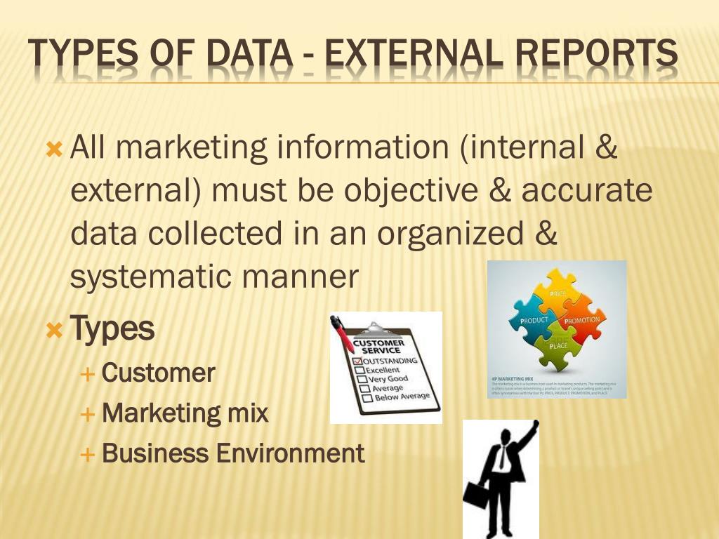 All marketing information (internal & external) must be objective & accurate data collected in an organized & systematic manner • Types • Customer • Marketing mix • Business Environment Types of data - External Reports