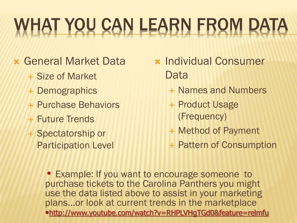 What you can learn from data • General Market Data • Size of Market • Demographics • Purchase Behaviors • Future Trends • Spectatorship or Participation Level • Individual Consumer Data • Names and Numbers • Product Usage (Frequency) • Method of Payment • Pattern of Consumption • Example: If you want to encourage someone to purchase tickets to the Carolina Panthers you might use the data listed above to assist in your marketing plans…or look at current trends in the marketplace • http://www.youtube.com/watch?v=RHPLVHgTGd0&feature=relmfu
