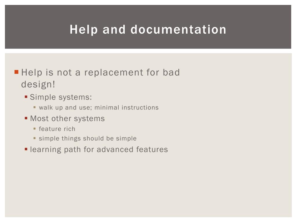 Help and documentation • Help is not a replacement for bad design! • Simple systems: • walk up and use; minimal instructions • Most other systems • feature rich • simple things should be simple • learning path for advanced features
