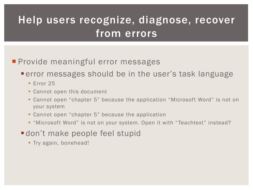 Help users recognize, diagnose, recover from errors • Provide meaningful error messages • error messages should be in the user’s task language • Error 25 • Cannot open this document • Cannot open “chapter 5” because the application “Microsoft Word” is not on your system • Cannot open “chapter 5” because the application • “Microsoft Word” is not on your system. Open it with “Teachtext” instead? • don’t make people feel stupid • Try again, bonehead!