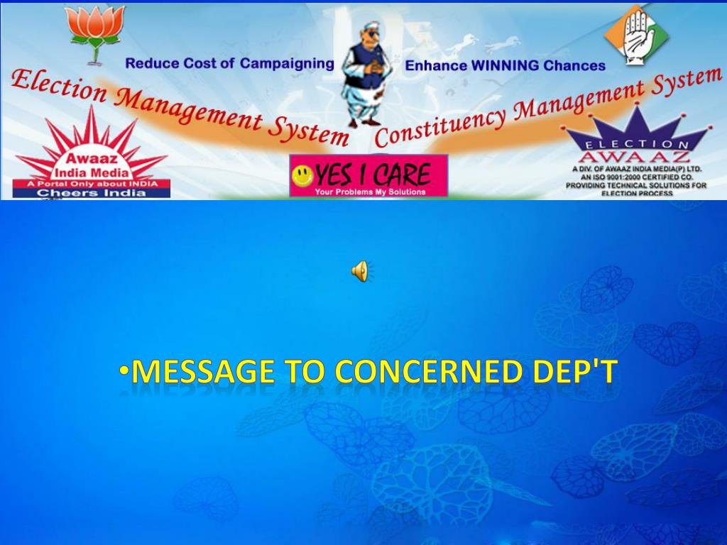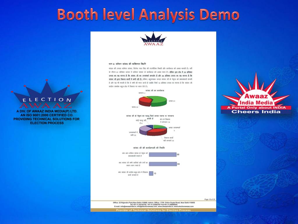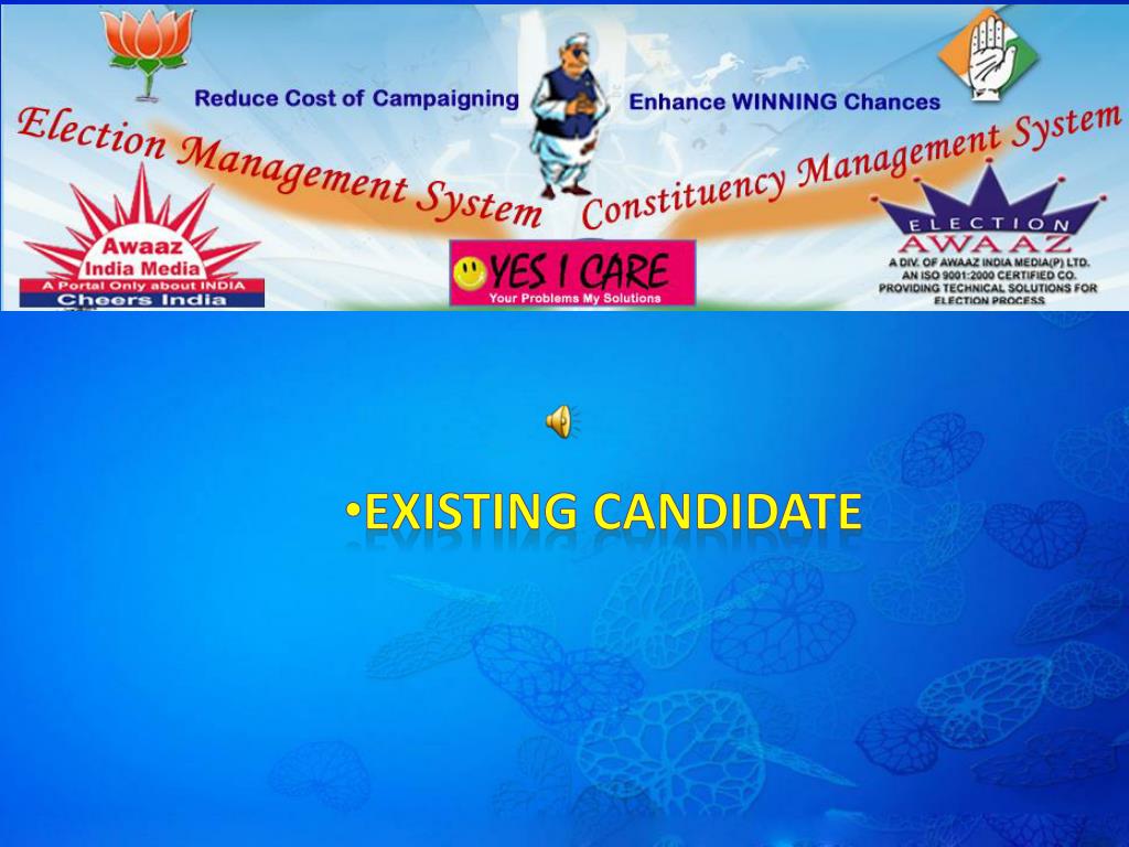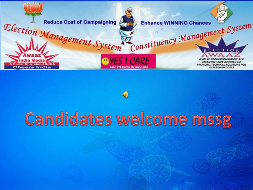 Election management system Pre -Election activates An effort by Election Awaaz India's First ISO 9001:2000 Certified Co in providing Election Technology to enhance your Winning Chances and to strengthen your position. This system will help you to be in total command of your elections. Manage your Constituency as well as your polling boothsminutely. This system is designed to carry out the various activities in connection with the elections to enable the contestant have a tension free , minimized cost election. Further it will help the candidate to have the true picture and build up his relationship with the voters , booth level agents and prominent people related to elections. Now it’s the time to act ,You got the resources we have the sources.