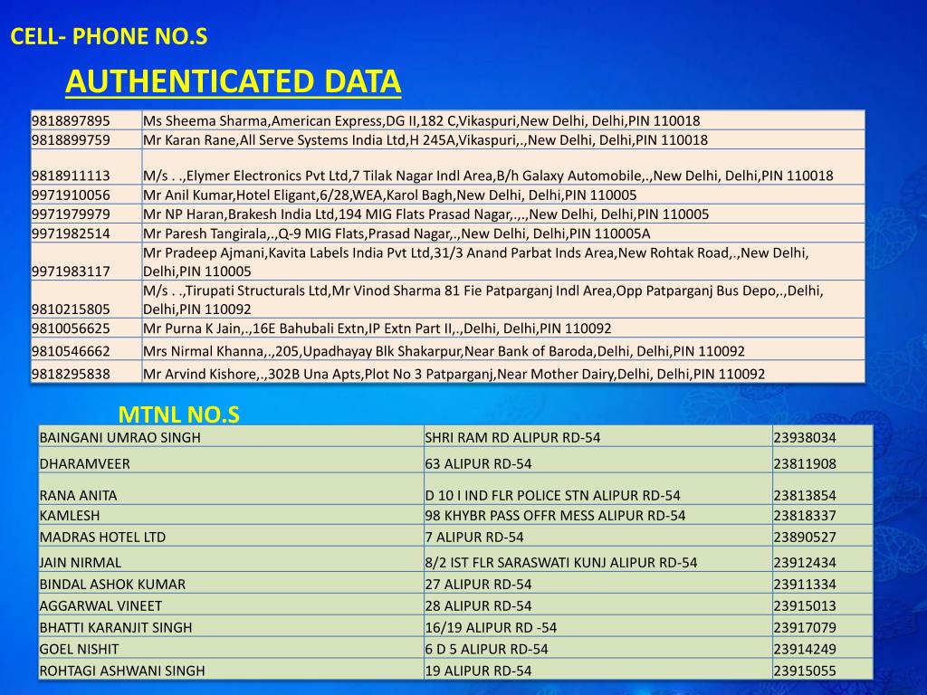 CELL- PHONE NO.S AUTHENTICATED DATA MTNL NO.S