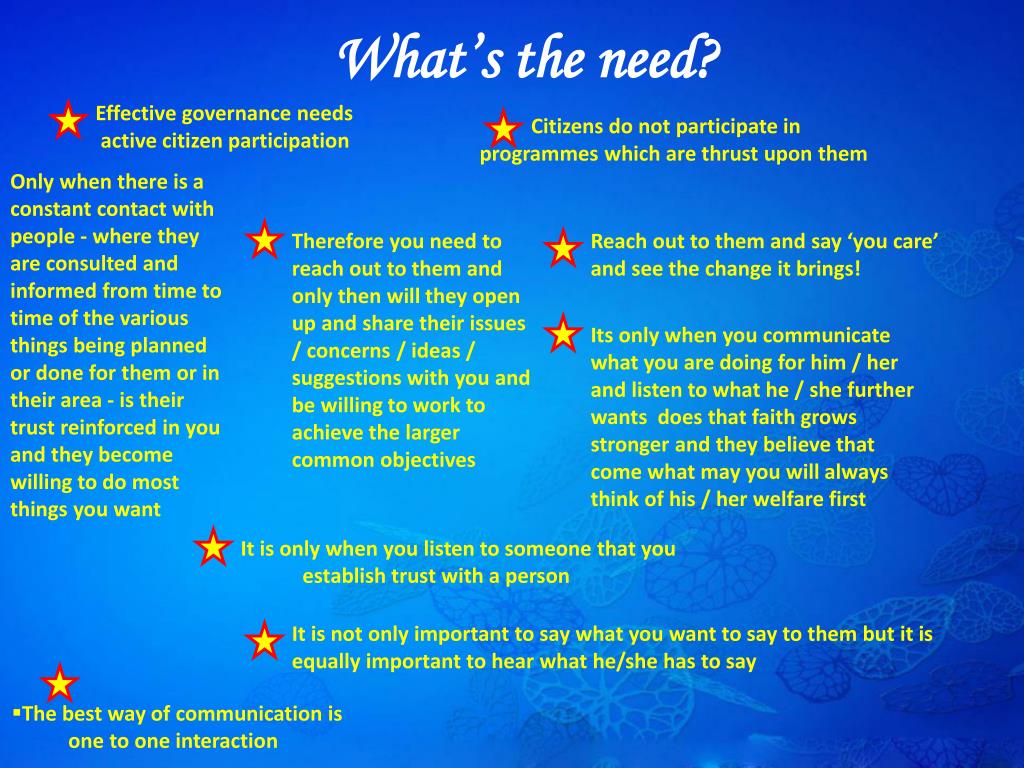 What’s the need? Effective governance needs active citizen participation Citizens do not participate in programmes which are thrust upon them Only when there is a constant contact with people - where they are consulted and informed from time to time of the various things being planned or done for them or in their area - is their trust reinforced in you and they become willing to do most things you want Therefore you need to reach out to them and only then will they open up and share their issues / concerns / ideas / suggestions with you and be willing to work to achieve the larger common objectives Reach out to them and say ‘you care’ and see the change it brings! Its only when you communicate what you are doing for him / her and listen to what he / she further wants does that faith grows stronger and they believe that come what may you will always think of his / her welfare first It is only when you listen to someone that you establish trust with a person It is not only important to say what you want to say to them but it is equally important to hear what he/she has to say • The best way of communication is • one to one interaction