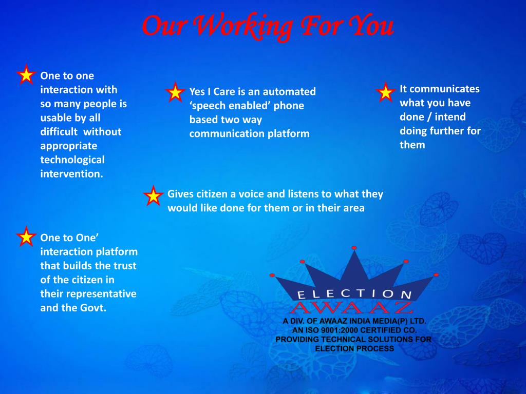 Our Working For You One to one interaction with so many people is usable by all difficult without appropriate technological intervention. It communicates what you have done / intend doing further for them Yes I Care is an automated ‘speech enabled’ phone based two way communication platform Gives citizen a voice and listens to what they would like done for them or in their area One to One’ interaction platform that builds the trust of the citizen in their representative and the Govt.