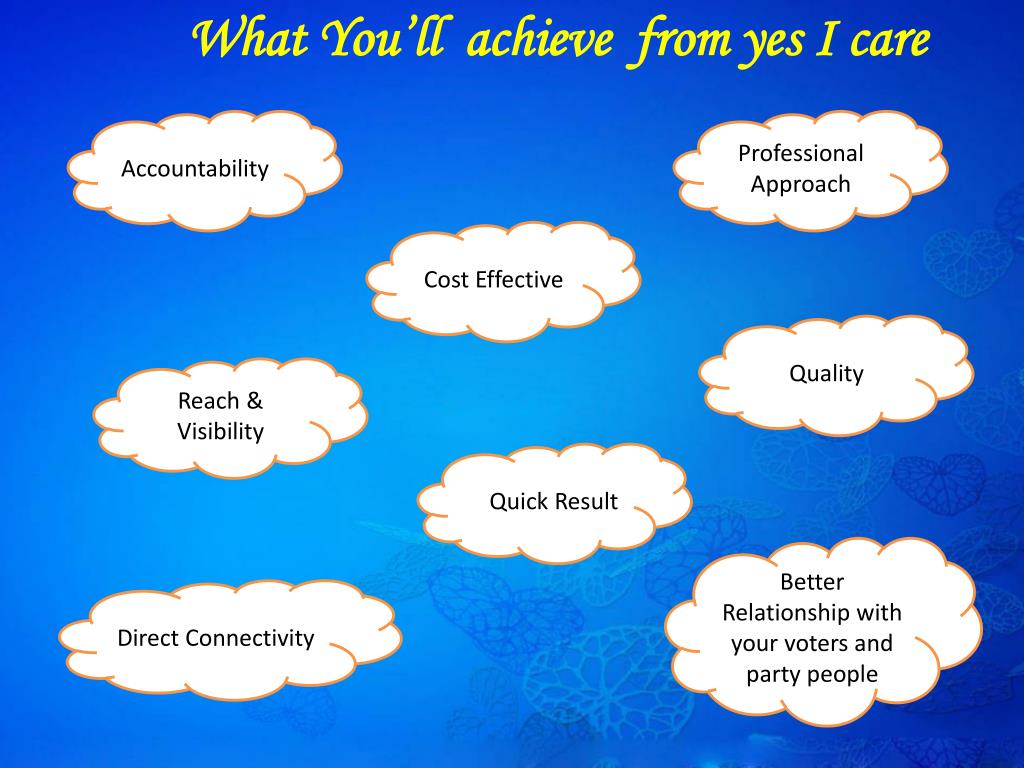 What You’ll achieve from yes I care Accountability Professional Approach Cost Effective Quality Reach & Visibility Quick Result Better Relationship with your voters and party people Direct Connectivity