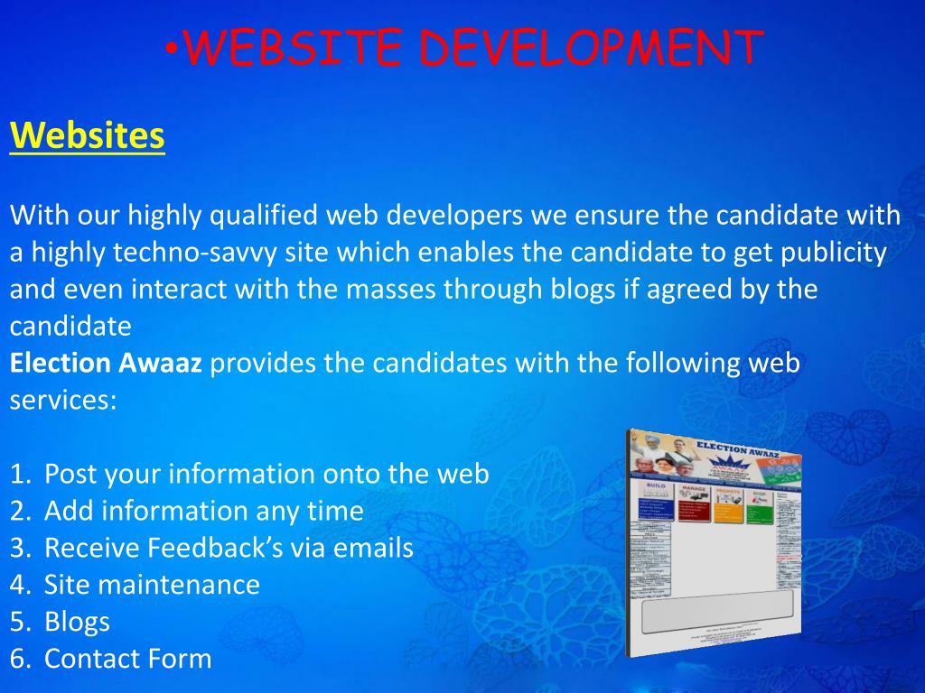 WEBSITE DEVELOPMENT • Websites • With our highly qualified web developers we ensure the candidate with a highly techno-savvy site which enables the candidate to get publicity and even interact with the masses through blogs if agreed by the candidate • Election Awaaz provides the candidates with the following web services: • Post your information onto the web • Add information any time • Receive Feedback’s via emails • Site maintenance • Blogs • Contact Form