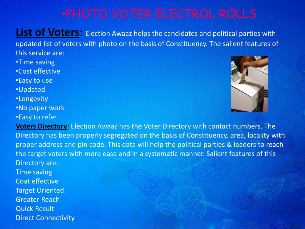 PHOTO VOTER ELECTROL ROLLS • List of Voters: Election Awaaz helps the candidates and political parties with updated list of voters with photo on the basis of Constituency. The salient features of this service are: • Time saving • Cost effective • Easy to use • Updated • Longevity • No paper work • Easy to refer • Voters Directory: Election Awaaz has the Voter Directory with contact numbers. The Directory has been properly segregated on the basis of Constituency, area, locality with proper address and pin code. This data will help the political parties & leaders to reach the target voters with more ease and in a systematic manner. Salient features of this Directory are: • Time saving • Coat effective • Target Oriented • Greater Reach • Quick Result • Direct Connectivity