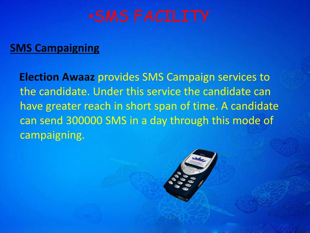 SMS FACILITY SMS Campaigning Election Awaaz provides SMS Campaign services to the candidate. Under this service the candidate can have greater reach in short span of time. A candidate can send 300000 SMS in a day through this mode of campaigning.