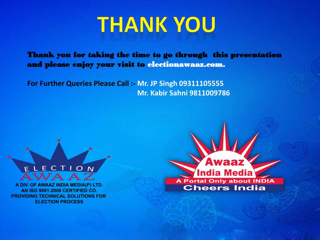 THANK YOU Thank you for taking the time to go through this presentation and please enjoy your visit to electionawaaz.com. For Further Queries Please Call :- Mr. JP Singh 09311105555 Mr. Kabir Sahni 9811009786